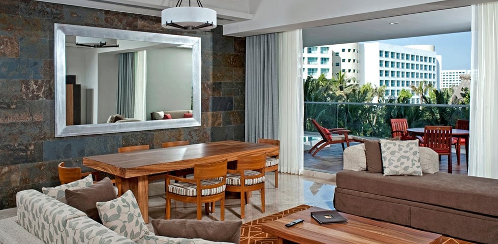 Recipient of the Five Diamond Award, Grand Luxxe at Vidanta Nuevo Vallarta offers one of the most exclusive and luxurious vacation experiences in Mexico. Situated along the eastern edge of the resort, five beautifully designed towers follow the Ameca River to where it meets the Bay of Banderas. This plush, modern resort is located on Mexico’s Pacific coast and faces a white sand beach lush, green jungle surroundings.